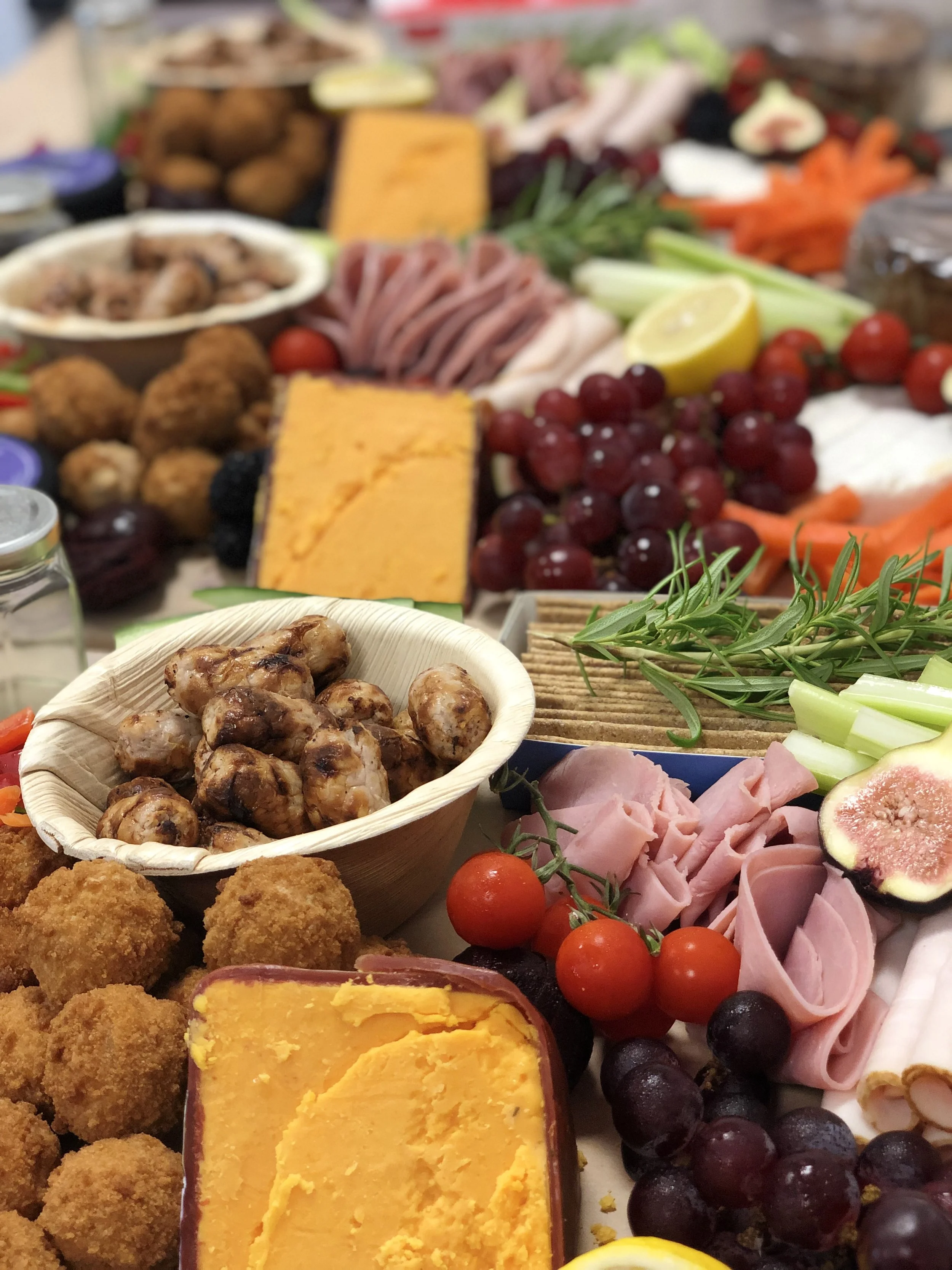 The British Feast includes Freshly baked breads, Melton Mowbray Pork Pie, A selection of British meats, and cheeses including our current favourite the Snowdonia Red Storm, and a Somerset Brie with assorted biscuits and chutneys. Pickled onions, veggies and dips, nuts, crisps, and fruit.